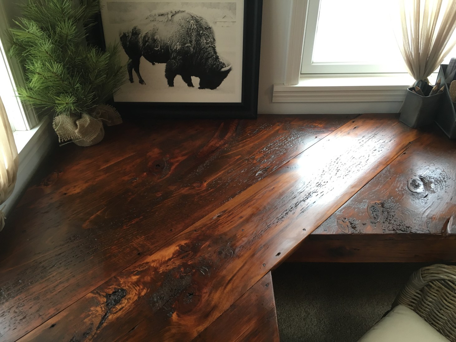 He belt sanded the wood. Then we stained it with a provincial wiping stain. We used this stain throughout the house. On pine it is MUCH lighter and I know this looks very dark, but the old wood is so porous. Plus it is cedar which gave it have a red tinge. We also used left over oil base polyurethane he had left from over from refinishing the floors.