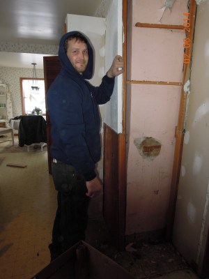 I have to start by saying, poor Doug. I will admit, I was one of those nagging housewives, begging him to start on a few house projects. I didn’t like anything. From the vinyl floors to the cheap wood paneling and wallpaper. It was a constant battle trying to make your new home “your own,” all while fighting the ugly blue wallpaper that made decorating for Christmas a nightmare. Well, after a little too much DIY telvesion and Nichole Curtis on Rehab Addict, I think he had enough. If you have ever watch Rehab Addict you would know at the beginning of each show, they show her uncovering brick behind a wall saying, “I just want brick!” Doug had always known we had brick hidden behind our cupboards, yet I was oblivious of this the entire time. He had watched a few of her shows unwillingly to say the least and after he spilled the beans to me that we ourselves had brick hidden, I wouldn’t let it go! Every day I would chant, “I just want brick!!!” Then finally he had it. While eating steak dinner I made for us in our simple old farmhouse he got up and at that moment decided he would show me. With the cupboards full of baking supplies he unloaded the shelves on the floor and said, “Well here you go!! There is no turning back now!”