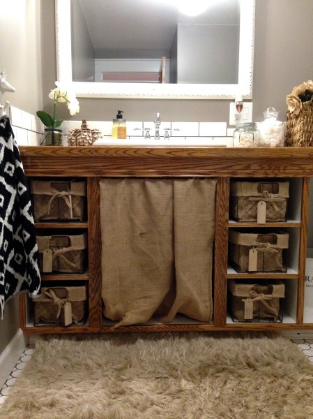 The bathroom counter is left over oak floor boards, and he built these cubbies for baskets just for me 🙂 More on this bathroom a few posts back on the blog.