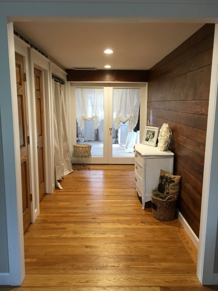 And just to the back left of this room is the hallway. We cut into the old plaster to make this an entry way. Before their was a dark and dreary hallway to the back of the home where the stairs existed. The wall to the right is where the stairs were, and covered in green carpet along with the entire home! I know this hallway may look a little funny, but it’s a work in progress. The first door on the left is to the basement which before was the only access to go outside. And the second door is to the downstairs bathroom.