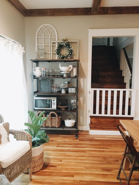 Just behind me is the kitchen. It is the original kitchen from the 80’s that his grandparents put in. As much as I’d love to rip it out and do white shiplap with open shelving and so much more, this will have to do. The ceiling height was just at the top of the cabinets so Doug added the crown molding to try and help with the flow especially to tie into the coffee bar. The coffee bar was the door into the home and those that follow me have heard this story too many times. I begged and begged Doug to move the door into the dining room that we were turning into the mudroom. But that involved more than either one of us wanted to endeavor. That included pouring new foundation, taking the entire wall out and exposing the home to every bug that wanted to come in. It was a rough week and I still do not have siding on that wall of the house, but it was worth it ; )