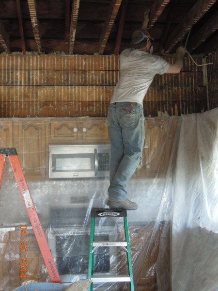 But this photo shows the hidden original ceilings. His grandparents dropped this ceiling sometime in the 60’s or 70’s with a remodel. But if you look close, there was beautiful gold wallpaper on those original 10 foot ceilings! Amazing uncovering the beauty of this original home.