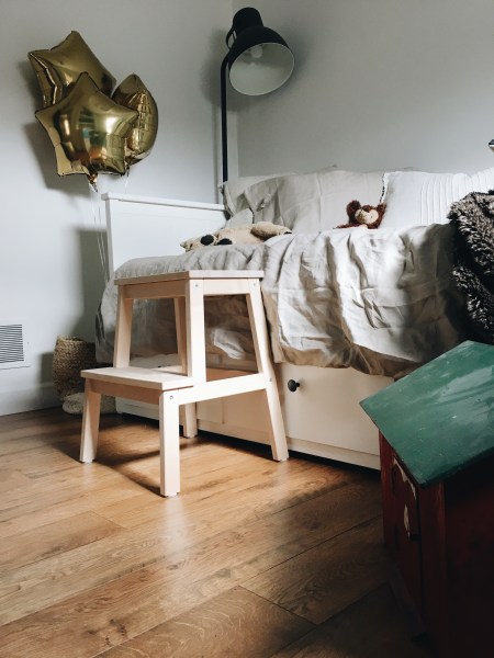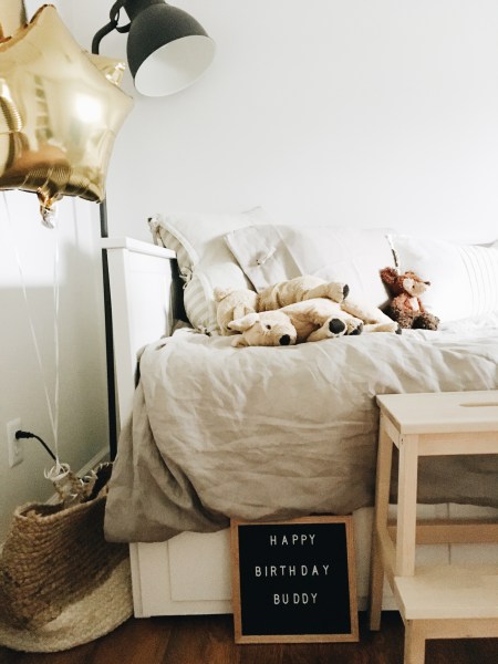 So here it is! Basically everything you see in this room is from IKEA. I have a love for antiques and wanted to be different, but then again you can’t beat their prices and I looovvveee the storage under here. This room is tiny and both boys clothes are in here along with diapers, wipes, and everything else imaginable. I was so worried moving him into a big boy bed so we could use the crib for Woodrow, but oh my gosh was I wrong to worry. That boy couldn’t be happier! I was starting the bath upstairs when he first saw it. He stopped in his tracks, and just stared at first. When I told him, “Auburn look what daddy made you! It’s your Big Boy bed for your birthday!” He lit up ear to ear, and climbed right in. He grabbed his blanket and dog and laid down pretending he was sleeping. Then he would get out of his bed and peek around the corner to me and yell, “Momma!! Momma!!! I slept good!” Ohh boy did that make my heart melt. The things you don’t notice until your toddler says things like that. Every morning and afternoon after his nap I always give him a kiss and ask if he’s slept good 🙂